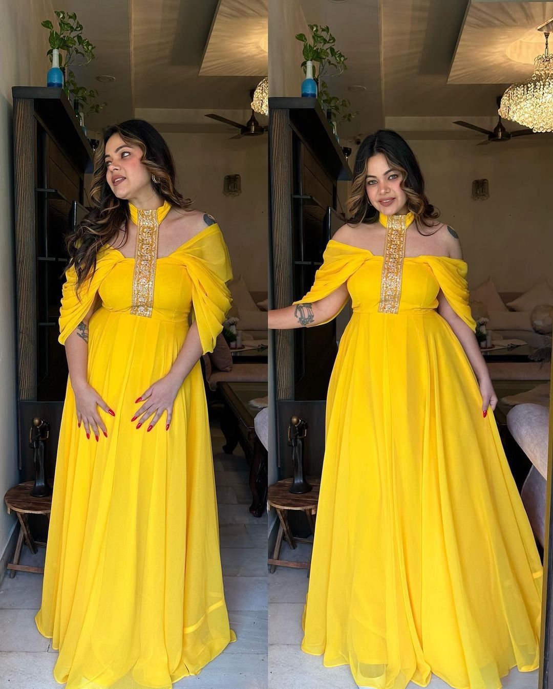 Looking for this same colour beautiful Designer Padded Gown on Faux Georgette Febric with inner and Thred & Sequnce work.