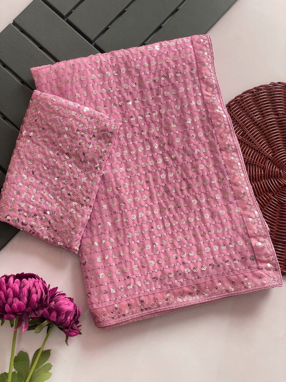 Onion Colour Georgette Saree With Heavy Sequins Embroidery