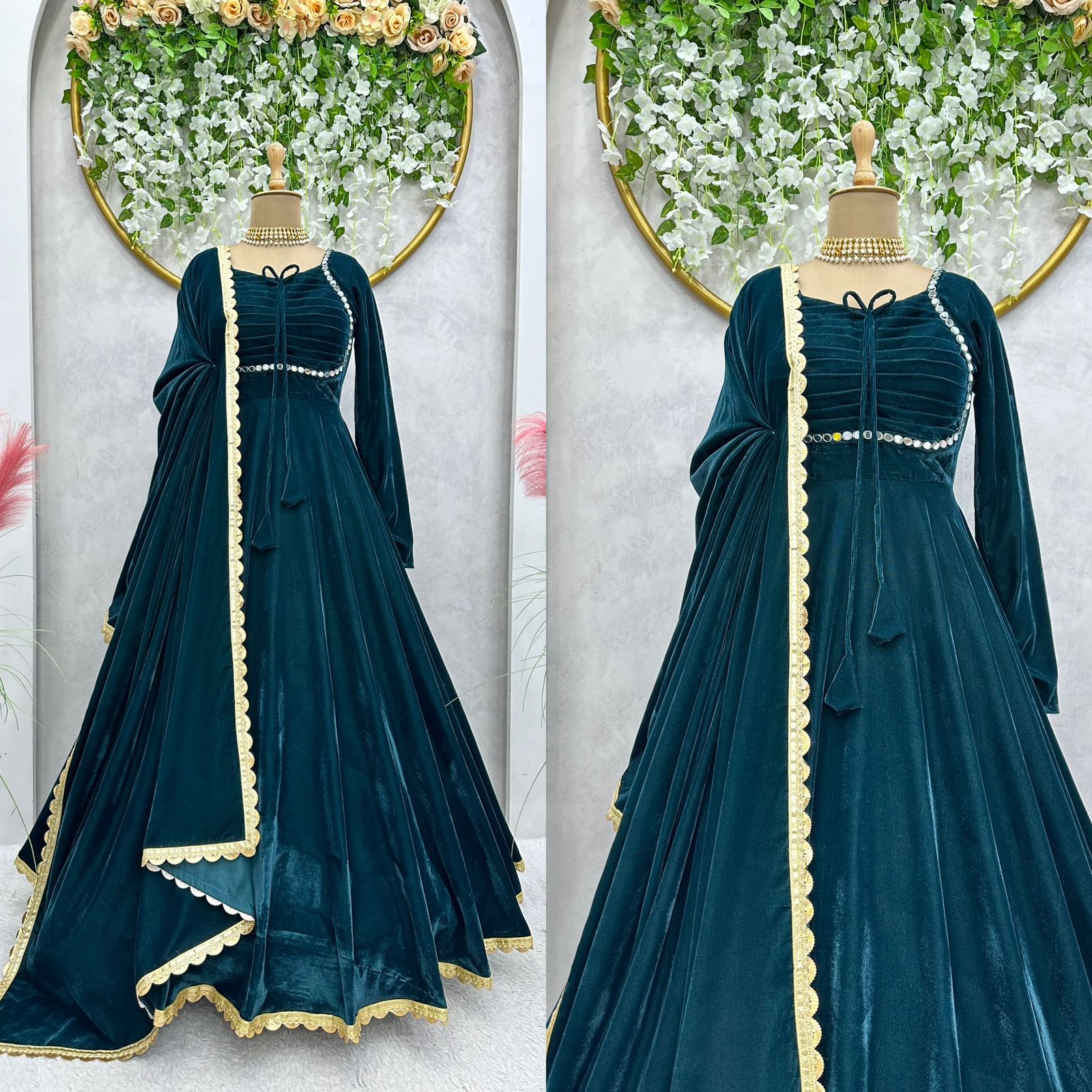Looking for this same color beautiful Designer Padded Gown on Havy Velvet Fabric With Real mirror & Lace work and Pent on also Velvet Fabric and Dupatta on Also Velvet Fabric With Lace work.