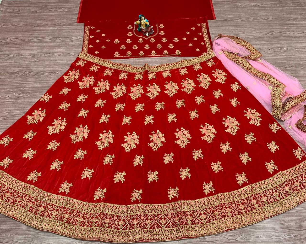 Thrilling Red Color Coding Multi Embroidered Work Velvet Design Lehenga Choli