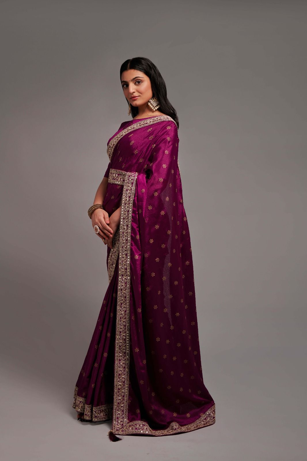 Wine Color Chinon Silk All Over print and Coding Work Saree